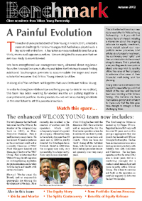 | Informing clients about their latest news was the aim for independent financial advisers Wilcox Young. Bartistic interpreted their requirement and the result was a simple and colourful A4 newsletter.